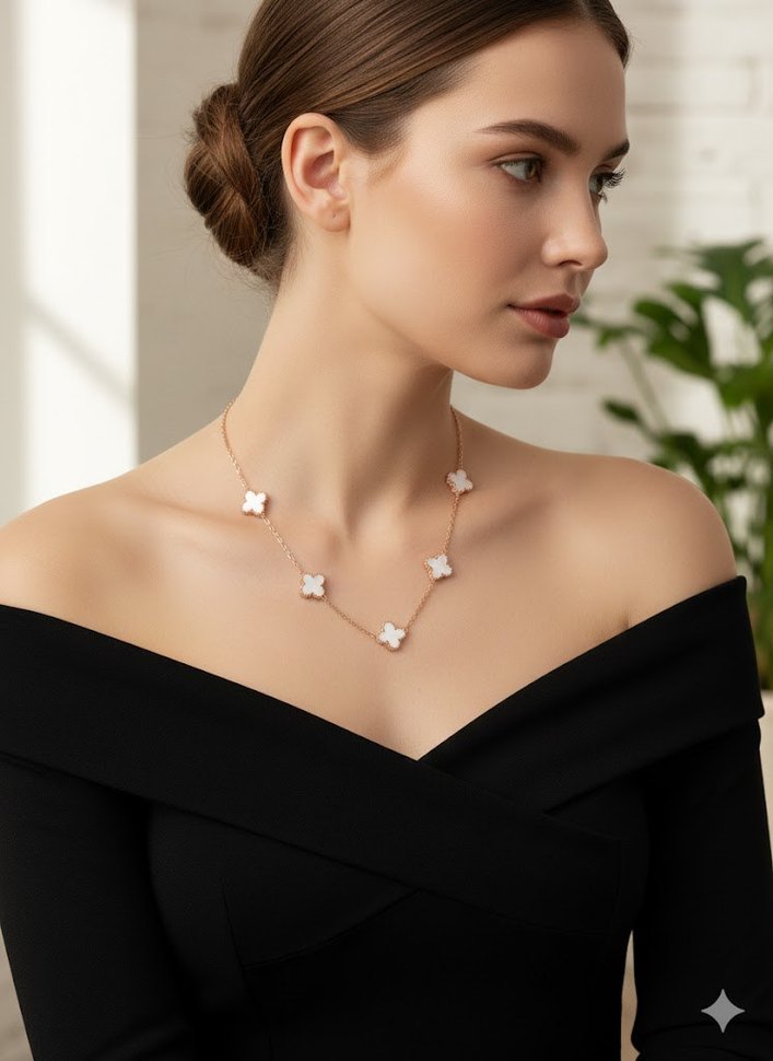 Çiçek şeklinde küçük detaylara sahip zincir detaylı kısa beyaz kolye, düğün ve şık etkinlikler için uygun.