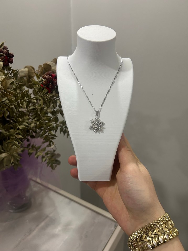 Kısa uzunlukta, zincir detaylı, beyaz-gri tonlarında mini çiçek desenli kolye, düğün ve şık anlar için uygun.