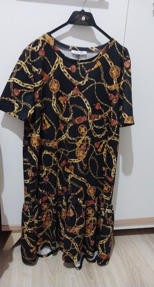 Kısa kol ve bisiklet yaka detaylı, zincir desenli, bol kesim mini kadın elbisesi. Sokak modası ve bohem tarzını yansıtır. ✨