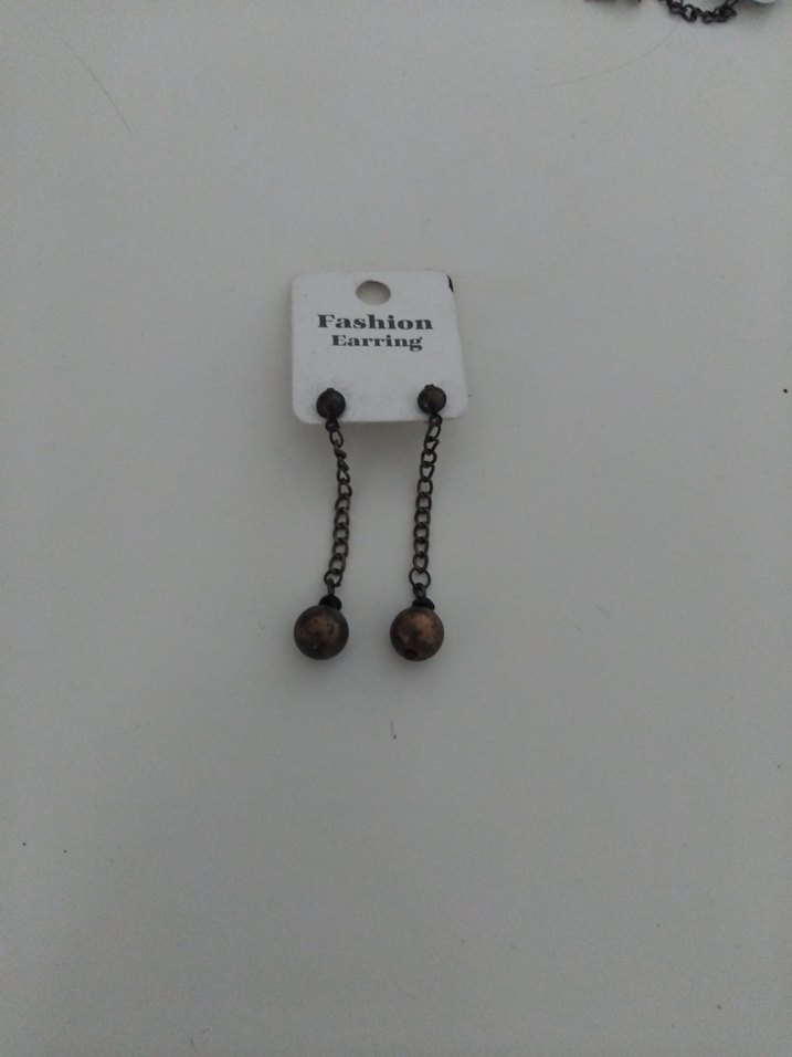 Parlak kahverengi zincir detaylı, kısa uzunlukta, minimal bohem tarzda günlük kullanıma uygun kadın küpesi. Üzerinde Fashion yazısı bulunur.