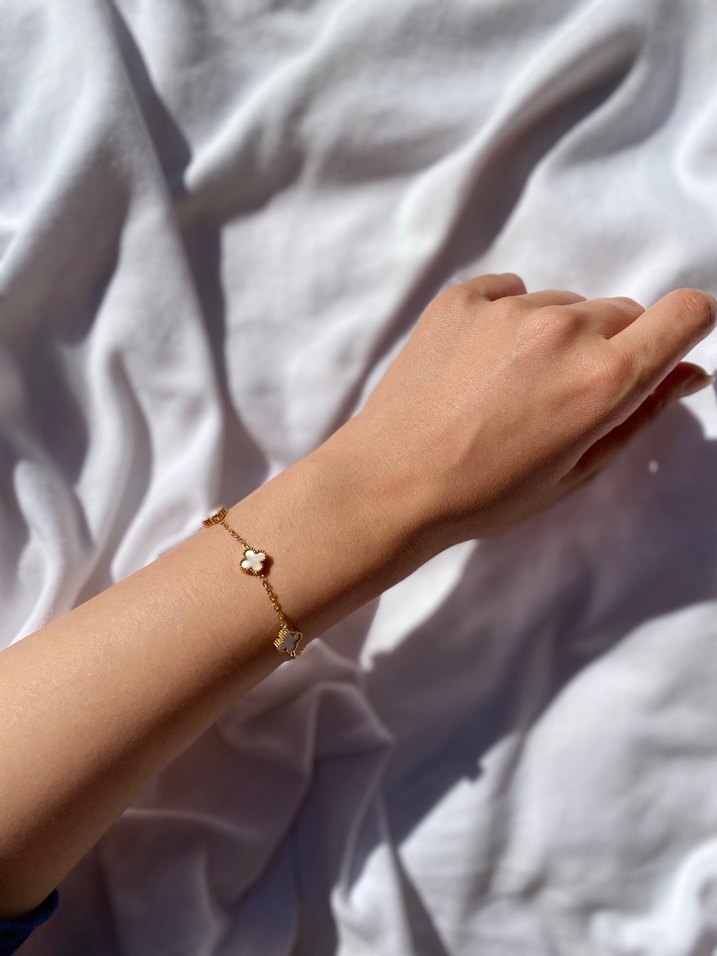 Altın renkli, zincir detaylı ve minimal çiçek süslemeli bileklik, günlük sokak stili için uygun şık bir aksesuar.