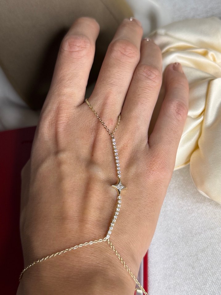 Altın renkli, zincir detaylı minimalist tasarıma sahip kadın el zinciri. Küçük parlak taşlarla süslenmiş, düğün ve bohem stiller için uygun. ✨şahmeran
