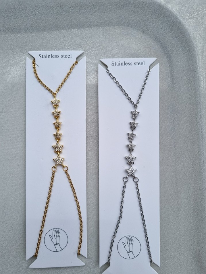 Paslanmaz çelikten yapılmış, yıldız desenli zincir detaylı minimalist el zinciri. Günlük kullanıma uygun, bohem tarzda ve altın renkli.