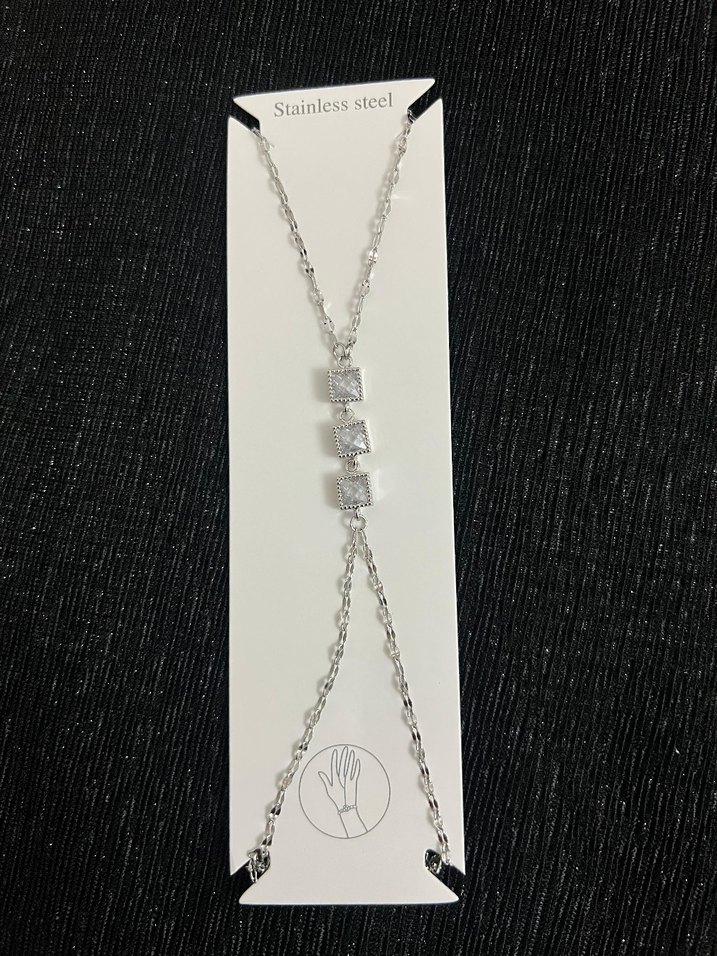 Gri ve beyaz tonlarda zincir detaylı, cesur ve çağdaş kadın el zinciri. Paslanmaz çelikten üretilmiştir, günlük kullanıma uygundur.