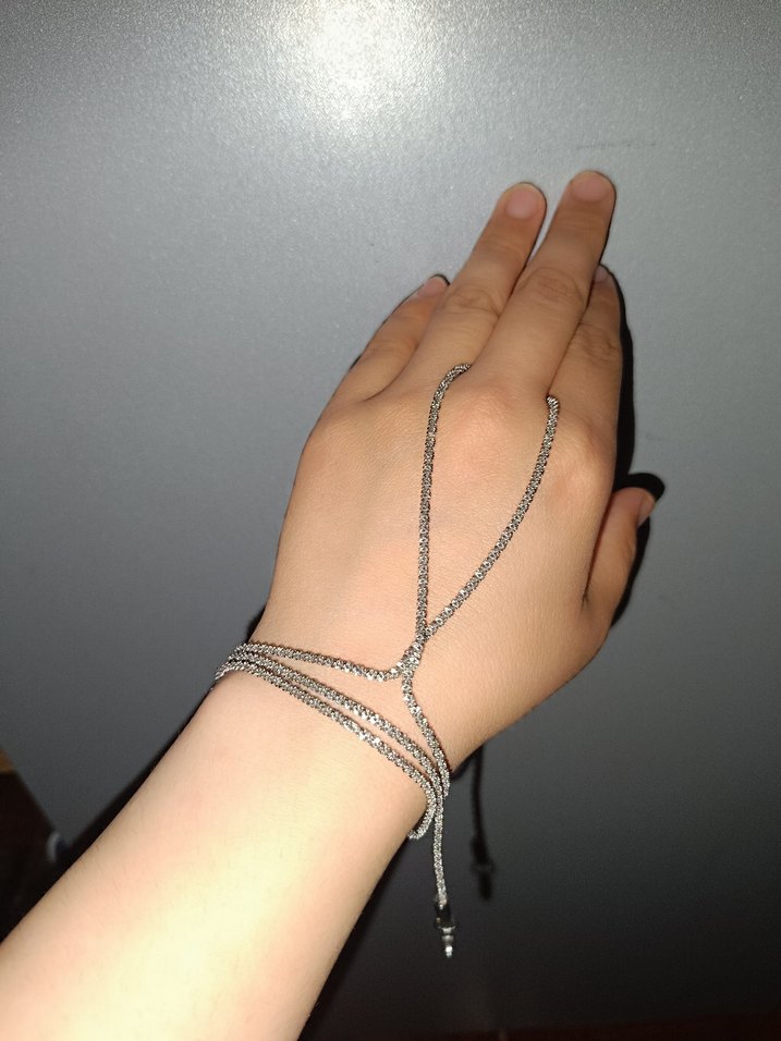 Zincir detaylı, gri tonlarda minimalist kadın el zinciri. Goth ve avangart tarzıyla günlük kullanıma uygun, desensiz ve şık bir aksesuar. ✨