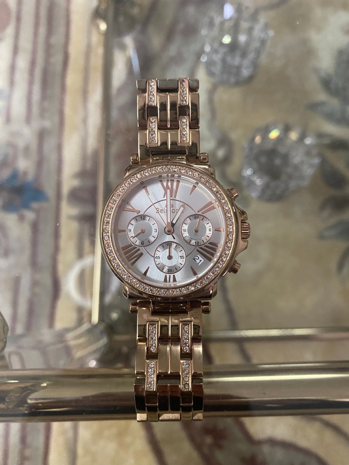 Parlak altın renginde, zincir detaylı kayışa sahip modern klasik tarzda kadın saati. Üç alt kadran ve tarih göstergesi bulunur. ⌚