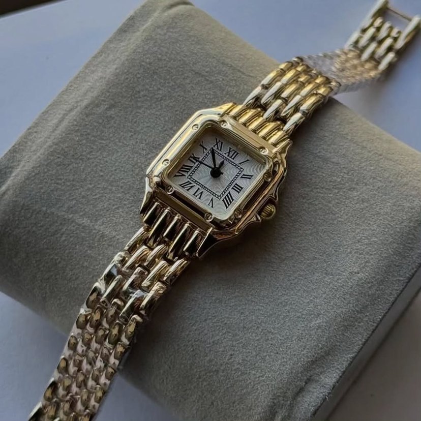 Parlak altın renkli, zincir detaylı kayışa sahip modern klasik tasarımlı kadın saati. Kadranda Roma rakamları bulunur. ⌚