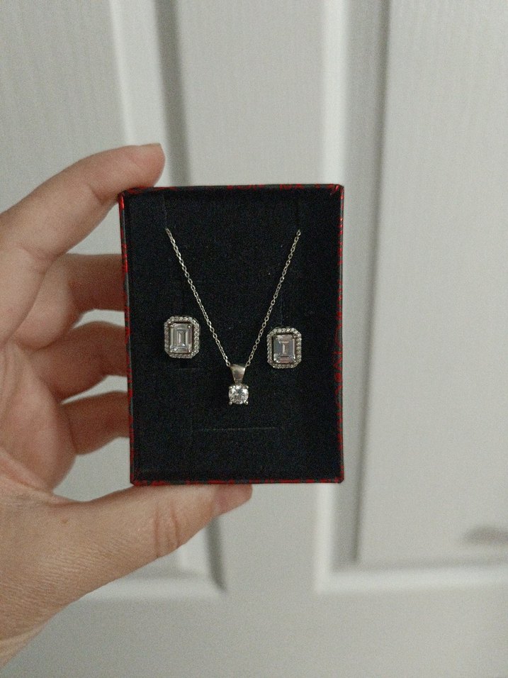 Zincir detaylı kolye ve gri desenli taşlı küpelerden oluşan modern klasik kadın takı seti, minimalist ve zarif bir görünüm sunar.