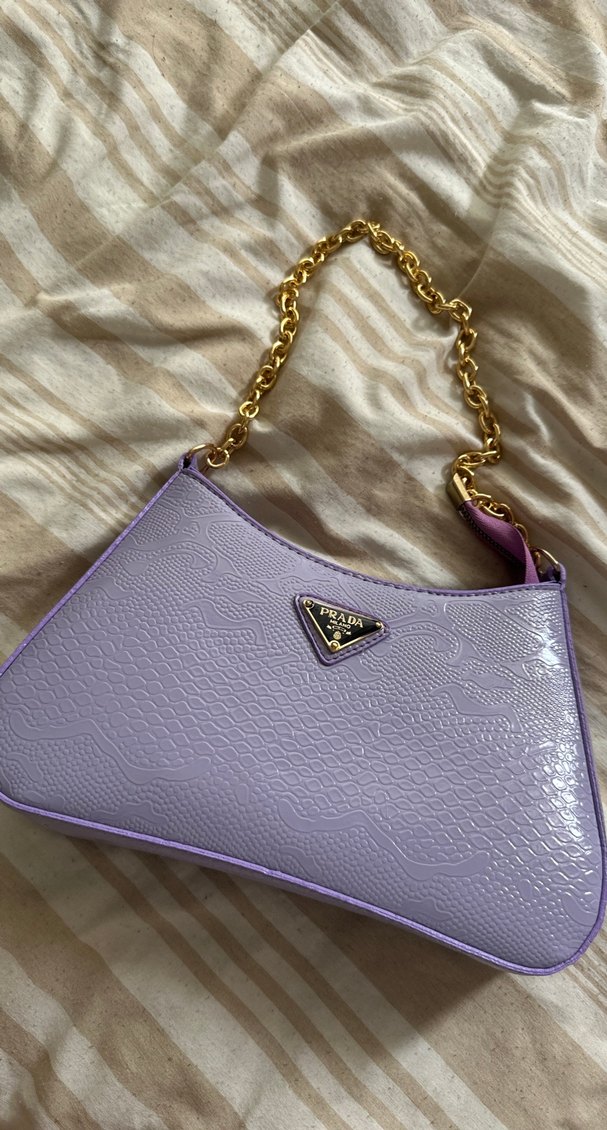 Mor deri, yılan desenli dokusu ve altın zincir detayıyla Prada çanta