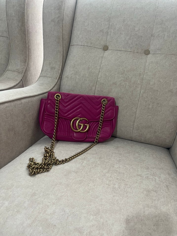 Zincir detaylı, baskılı desene sahip koyu mor deri kadın çantası. 'G' logosu bulunur, sokak modasına uygun trendy casual tarzda. ORİJİNAL Değil açma kapama yerinin düğmesi kopmuş