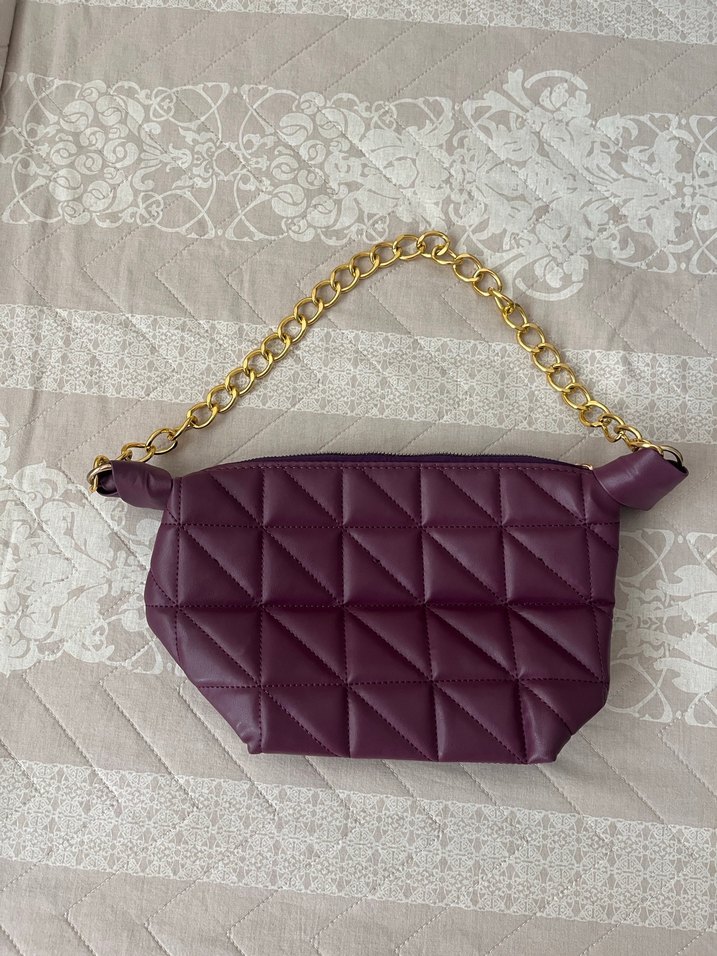 Koyu mor deri el çantası, zincir sap ve kapitone detaylara sahip, bohem ve şık tarz için uygun.