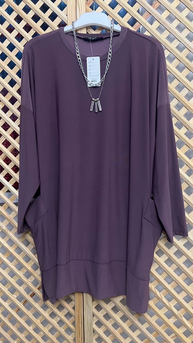 Zincir detaylı, mor renkli kadın tunik, salaş kesim ve uzun kollu. İpek gibi yumuşak kumaştan, günlük rahat kullanıma uygun uzun boyda. Ürün iki bedendir 44 46 48 uyumludur
