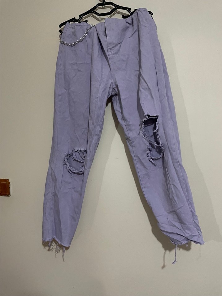 Zincir detaylı, yırtık dizlere sahip mor loose fit denim kot pantolon. Pastel tonlarda, günlük rahat sokak stili için uygun.
