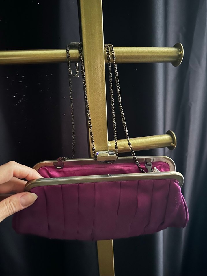 Mor saten dokulu, zincir detaylı clutch çanta, modern klasik tarzıyla romantik akşamlar için idealdir. Parlak yüzeyi şıklık katar.