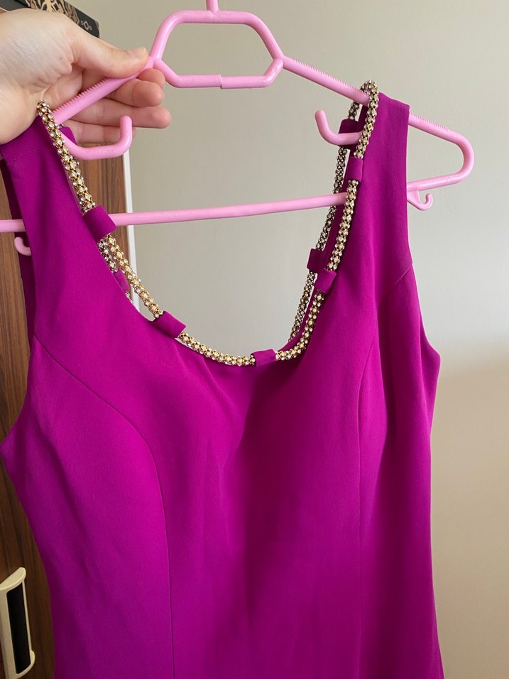 V yaka ve zincir detaylı, askılı, mor elbise. Modern klasik tarzda, fit kesimli, parti için uygun.