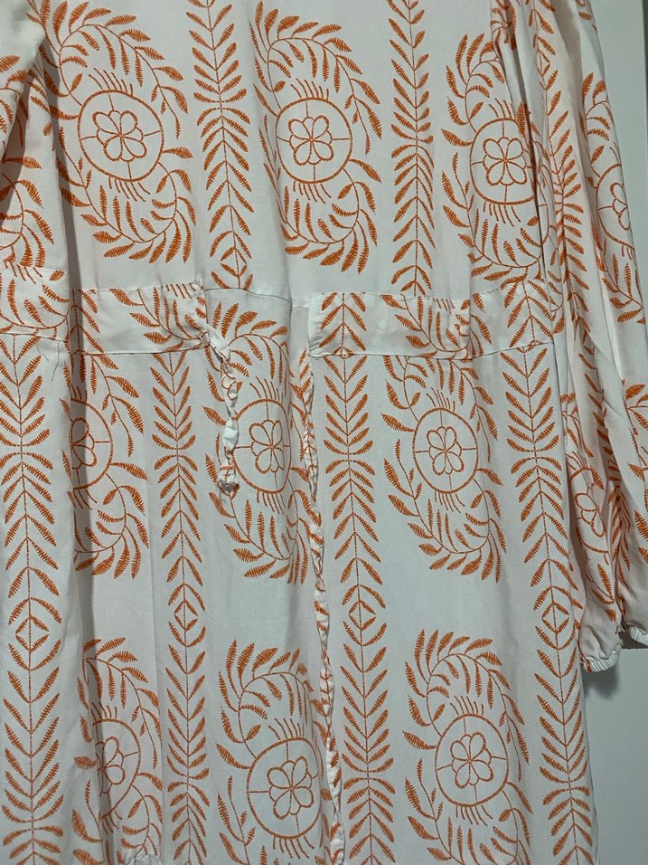 Nakışlı desenlere ve zincir detaylara sahip bej uzun elbise. Bohem tarzı, salaş kesim, tekne yakalı ve askılı kollu, yumuşak dokulu kumaş. İki kere giyildi