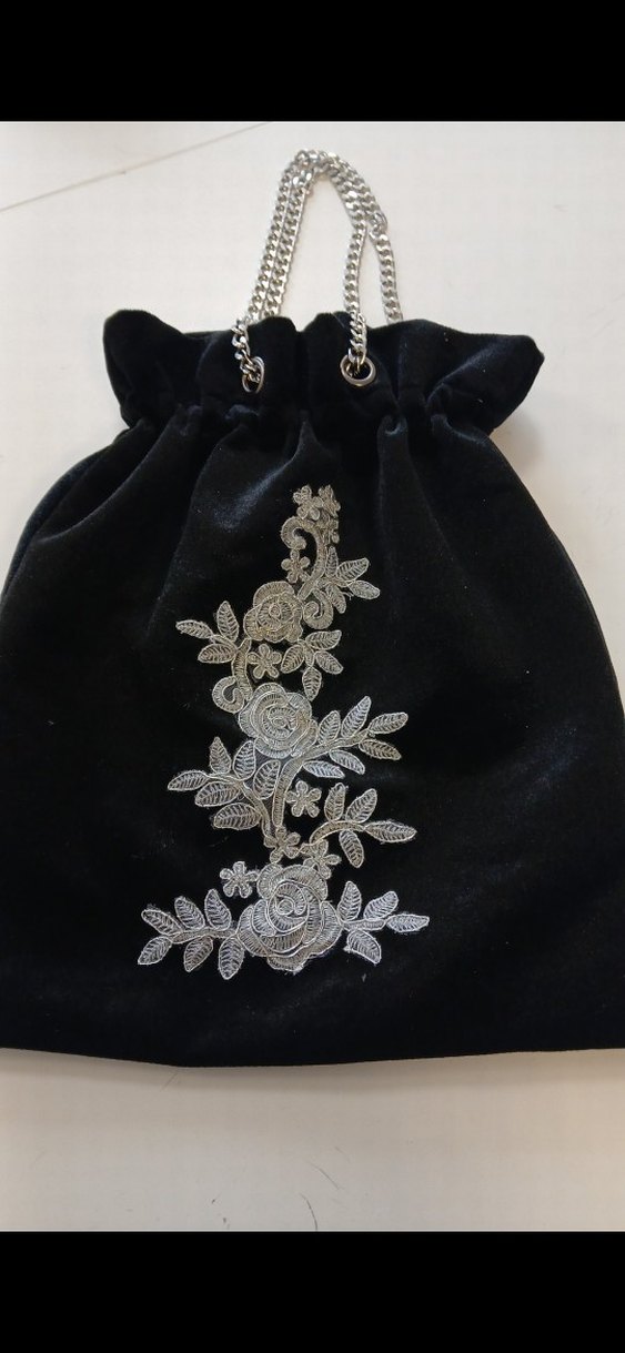 Zincir saplı siyah tekstil çanta, zarif nakışlı çiçek desenleriyle gotik ve klasik şıklığı bir araya getiriyor, düğünlere uygun.