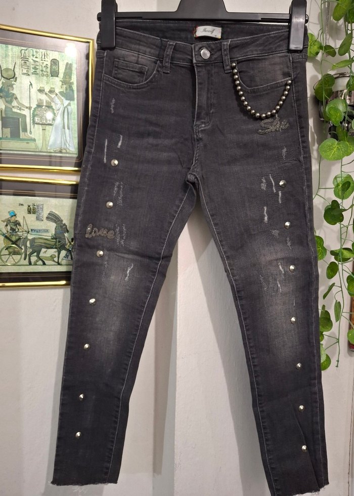 Zincir Detaylı Nakışlı Siyah Kadın Jean