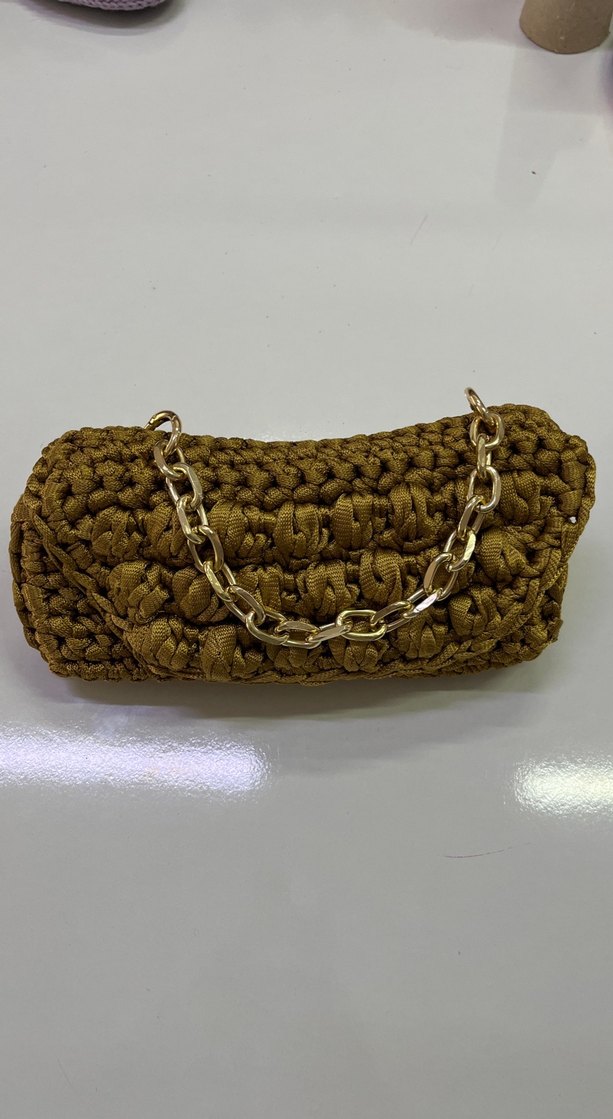 Parlak gold örgü kadın çanta, zincir detayıyla bohem tarzını yansıtır, günlük kullanım için uygundur.