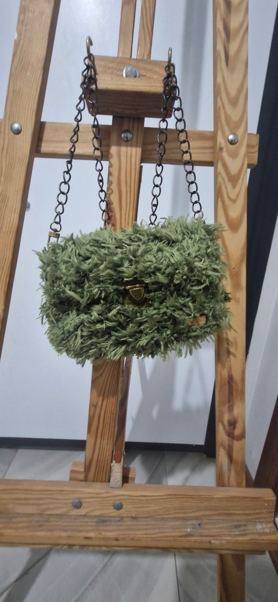 Yeşil örgü kadın çanta, zincir detaylı ve bohem tarzda, rahat dokusu ve desensiz yapısıyla dış mekan kullanımı için uygundur.