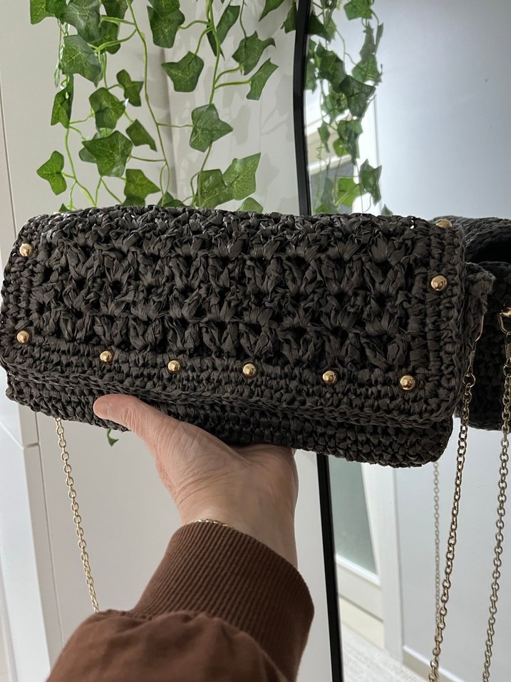 Kahverengi örgü kumaştan yapılmış, nakışlı desenlere ve zincir detaylara sahip bohem tarzda kadın çantası.