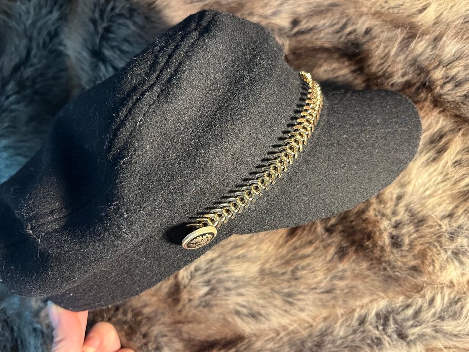 Koyu renk yünden yapılmış kadın şapkası, bohem Paris tarzını yansıtan altın zincir detayına sahiptir. Klasik ve özgün bir tasarım sunar.