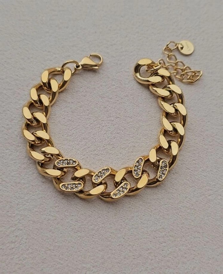 Parlak altın renkli zincir detaylı bileklik, desenli ve taşlı detaylarla süslenmiştir. Günlük kullanıma uygun, ışıltılı ve gösterişli. Çelik Ürün kararma yapmaz