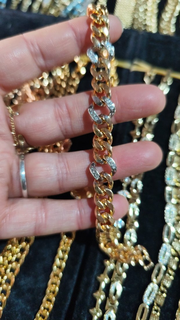 Kadın bilekliği, parlak altın zincir ve detaylı halkalar içerir, bazıları ışıltılı süslemelidir, günlük kullanım için uygundur.