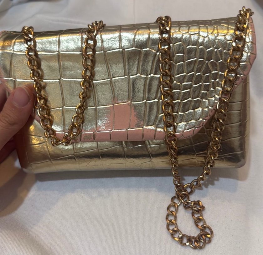 Parlak altın renkli deri çanta, yılan derisi desenli ve zincir detaylı, günlük kullanıma uygun modern tasarım.