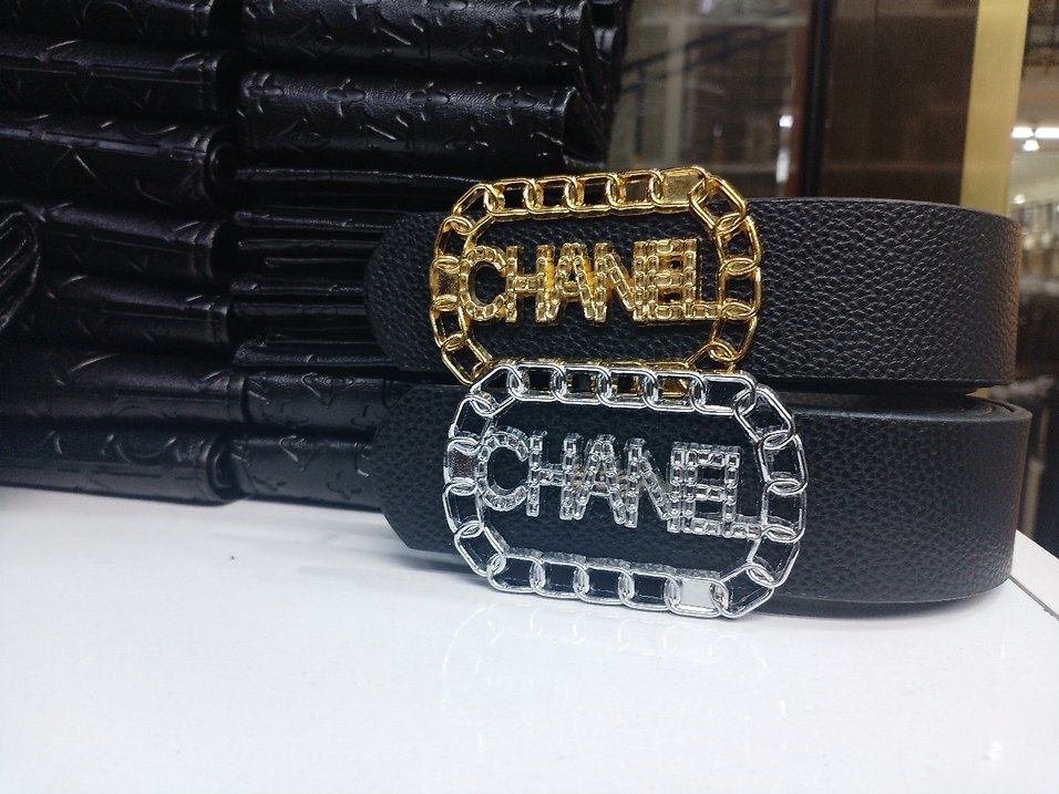Zincir detaylı, parlak altın renkli deri kadın kemeri. 'CHANEL' yazılı zincir çerçeve tokası ile gösterişli ve biker tarzı. ✨