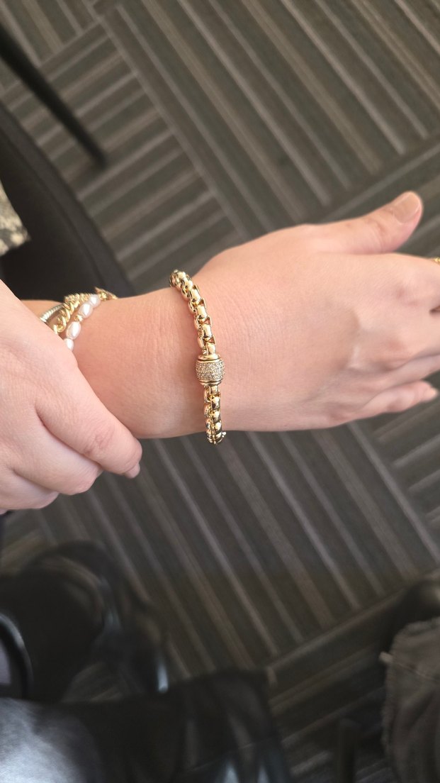 Parlak altın renginde, zincir detaylı ve yılan desenli kadın bileklik, klasik zarafetle çağdaş ışıltıyı birleştiriyor.