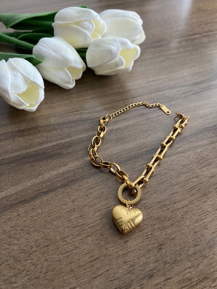 Parlak altın renkte zincir detaylı, kalp figürlü bileklik, cesur Paris tarzını yansıtır. Günlük kullanıma uygundur.