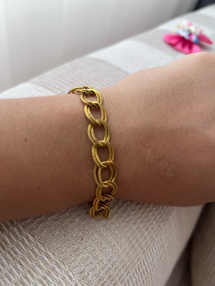 Parlak altın renkli, zincir detaylı kadın bileklik, günlük kullanıma uygun bohem tarzda. ✨Çelik