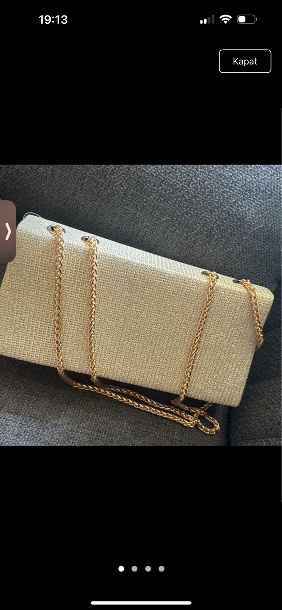 Parlak sentetik kumaştan, zincir detaylı altın renk kadın portföy çanta. Düğün ve özel günler için klasik ve çağdaş bir tasarım. ✨