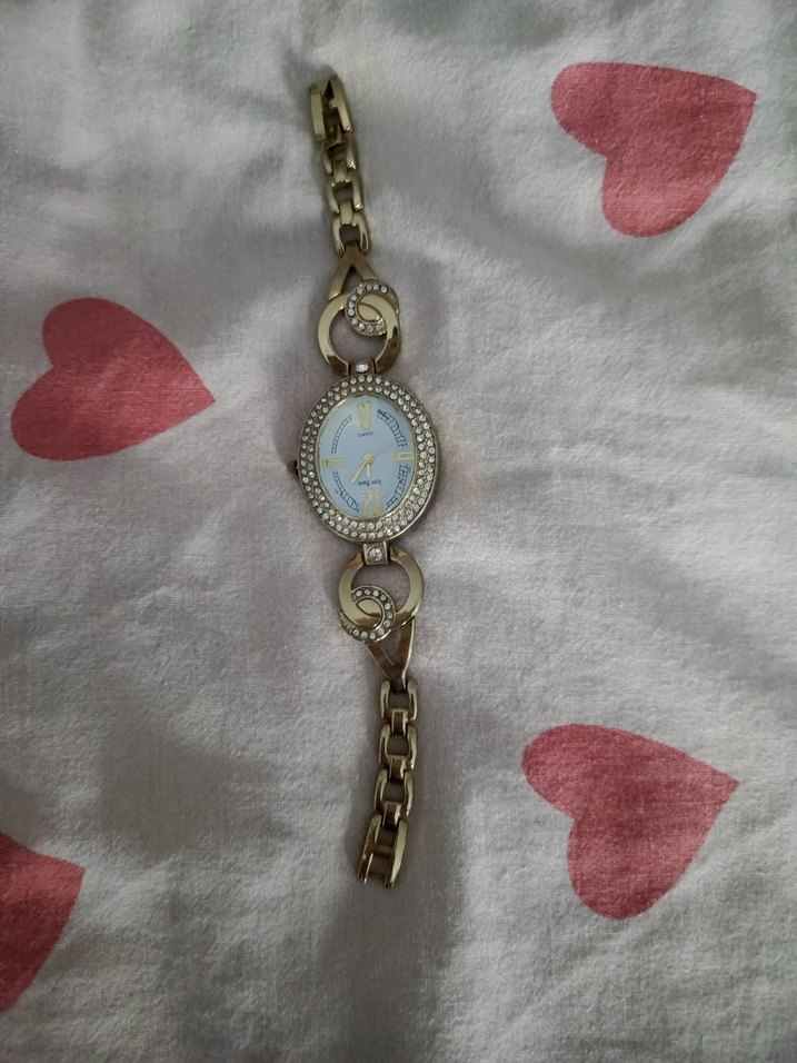 Parlak altın renkli, zincir detaylı kadın saati. Oval kadranı küçük taşlarla süslenmiş, klasik ve çağdaş tarzı bir araya getiriyor. ⌚