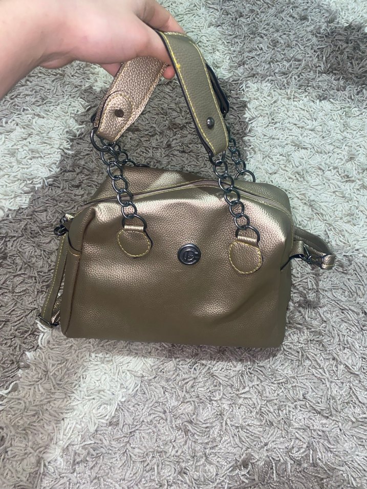 Zincir askılı ve parlak altın rengi büyük çanta.çok geniştir içine herşey sığar.hiçbir sıkıntısı yoktur.