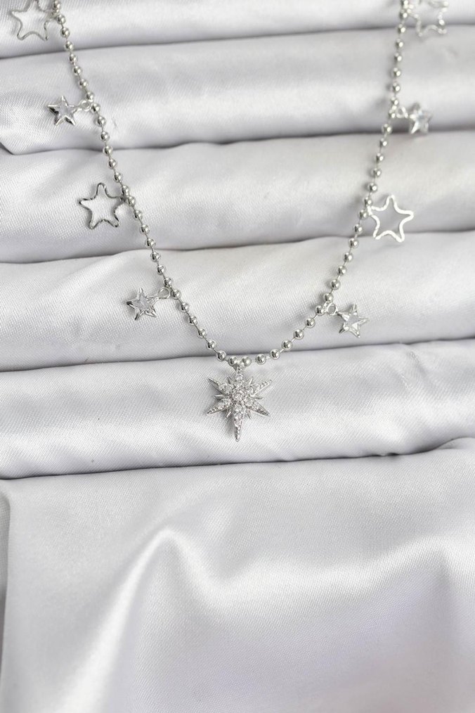 Parlak beyaz renkte, zincir detaylı ve yıldız figürlü süslemelere sahip midi uzunlukta kolye. Minimalist ve bohem tarzları bir araya getirir. ✨