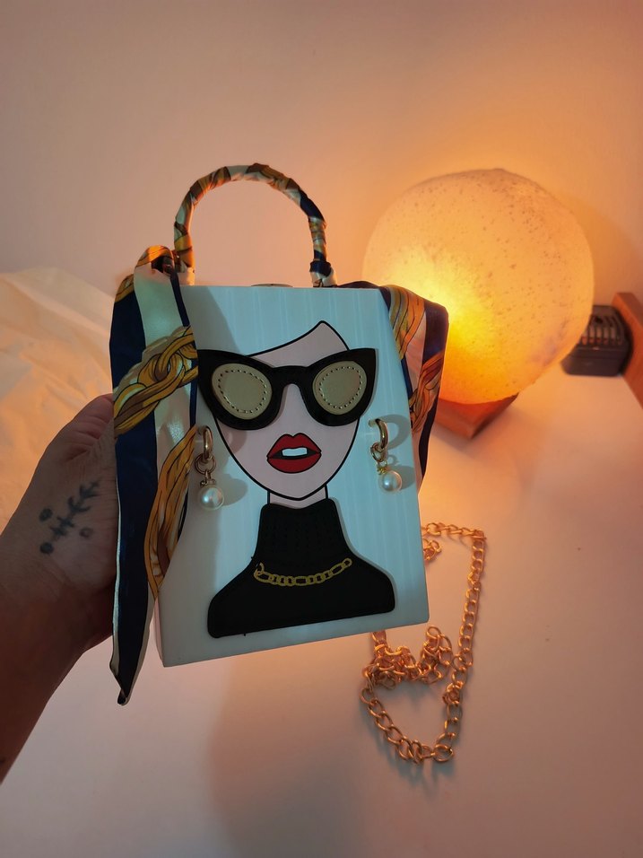 Parlak çok renkli baskılı, zincir detaylı kadın çantası. Sentetik kumaştan, fular sarılı sap ve altın tonlu zincir askı içerir.