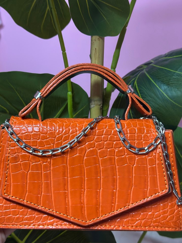 Parlak kahverengi deri, yılan derisi desenli ve zincir detaylı kadın çantası. Günlük kullanıma uygun, çağdaş ve trend bir tasarım.