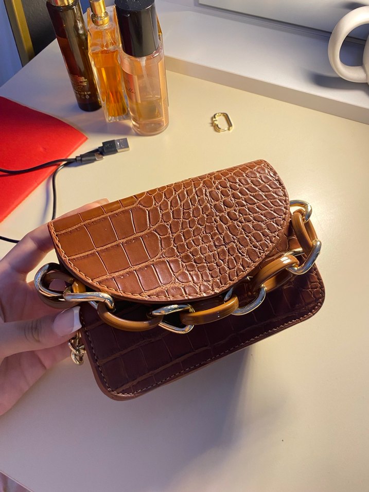 Zincir Detaylı Parlak Kahverengi Deri Çanta