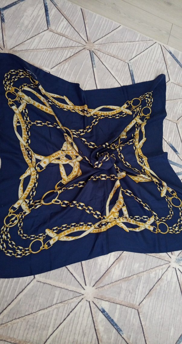 Parlak zincir detaylı, ipeksi dokulu lacivert kadın fular. Bohem ve Paris tarzını yansıtan retro tasarım, hippie ve bohem kişiliklere uygun.