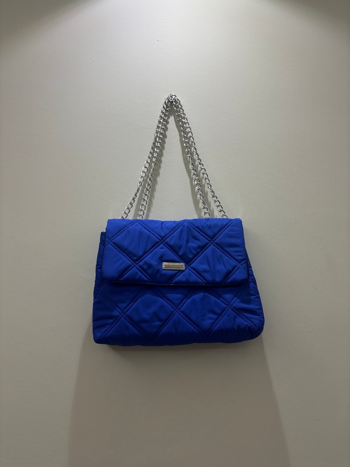 Parlak mavi renkli, zincir detaylı ve kapitone desenli kadın çantasıdır. Yumuşak sentetik kumaştan üretilmiştir ve sade stil için uygundur.