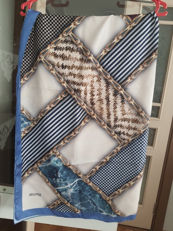 Parlak mavi renkte, zincir detaylı ve çeşitli desenlere sahip kadın fuları. Yumuşak sentetik kumaştan yapılmıştır. BELiNDA markalı, bohem ve Paris tarzı.