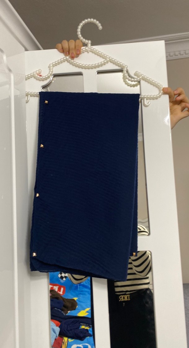 Sentetik kumaştan yapılmış, zincir detaylı parlak mavi kadın şalı, sade ve sokak modasına uygun Paris tarzını yansıtıyor.