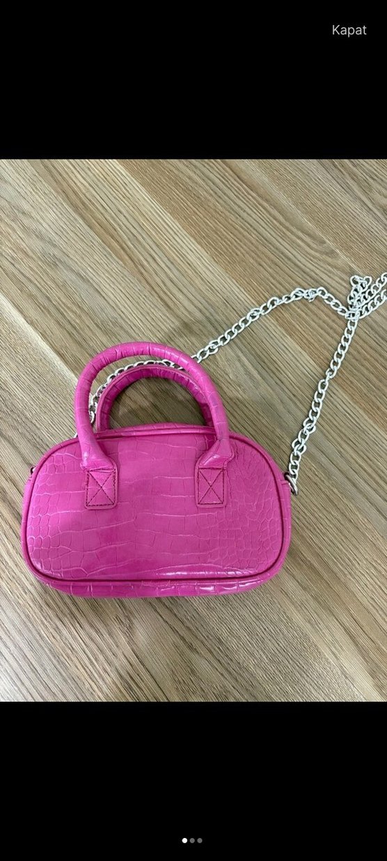 Zincir Detaylı Parlak Pembe Yılan Derisi Çanta