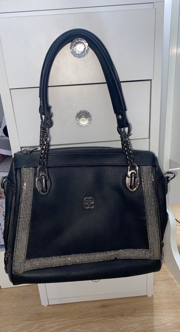 Parlak siyah deri kadın çanta, zincir detayları ve baskılı deseniyle trend ve gotik tarzlara uygun.