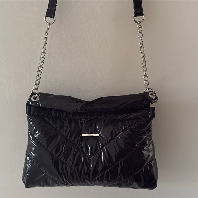 Parlak siyah sentetik kumaştan, zincir detaylı, desen içermeyen kadın çantası. Paris tarzı ve günlük kullanım için uygundur.