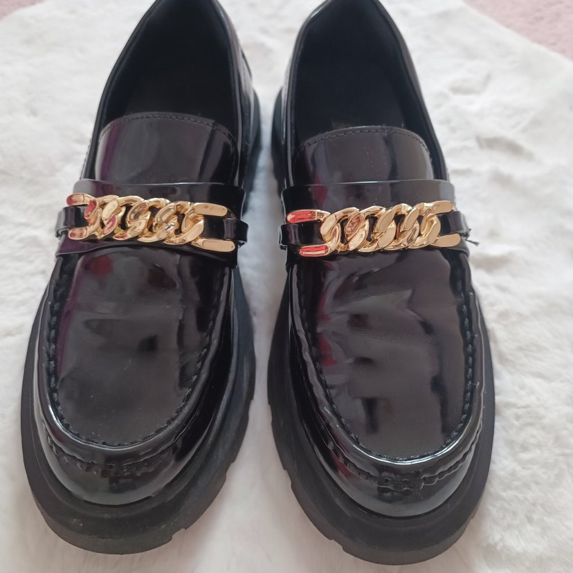 Parlak siyah renkte, altın zincir detaylı ve blok topuklu çocuk kız loafer. Kauçuk malzemeden, trend sokak stili için uygun.