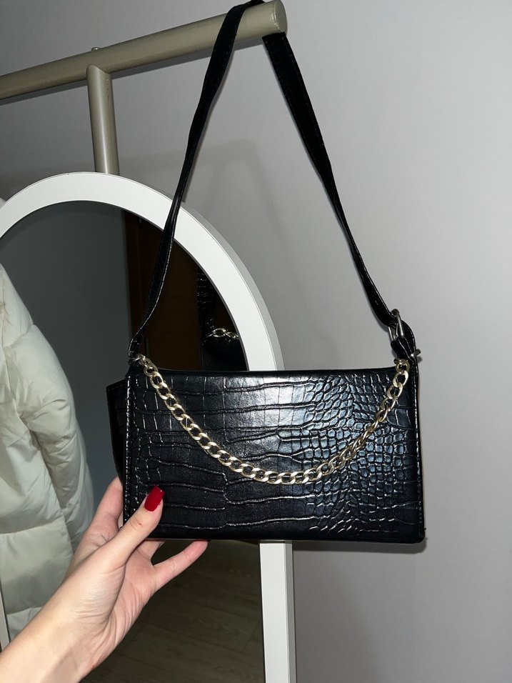 Parlak siyah deri çanta, yılan desenli ve zincir detaylıdır, trend sokak stili için uygundur.