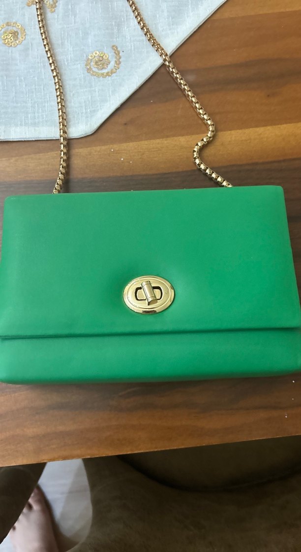 Parlak yeşil deri kadın çanta, zincir detaylı ve altın renkli tokalı, modern klasik tarzda, romantik akşamlar için uygundur.